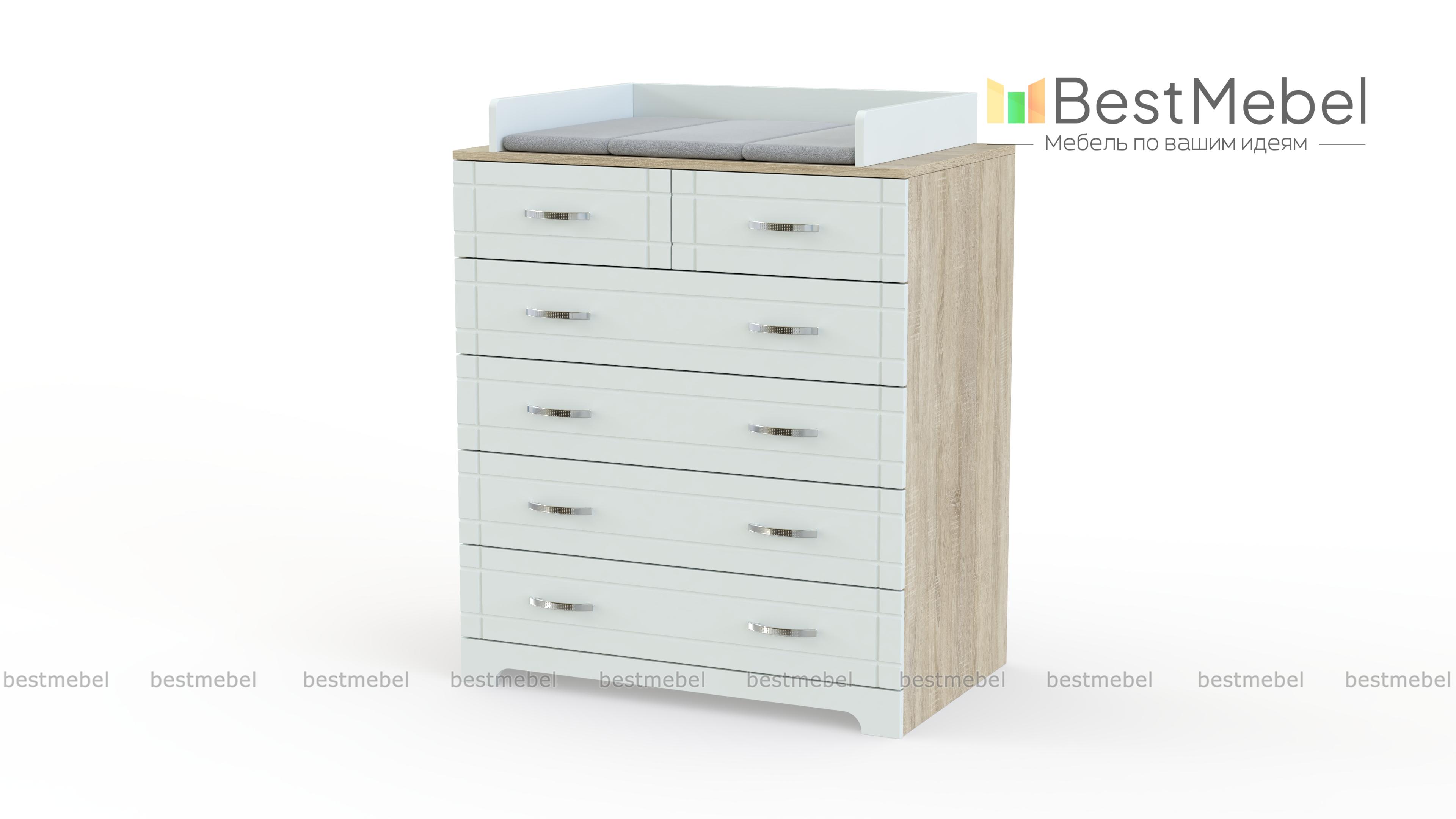 Пеленальный комод Кейт 4 BMS оснащен двумя малыми и четырьмя большими выдвижными ящиками, в которых разместятся как гигиенические средства и прочие мелочи, так и одежда и постельное белье. Пеленальная поверхность ограничена с трех сторон бортиками для защиты малыша от случайного падения и дополнена мягкой накладкой. Износостойкий цветной фасад с фрезеровкой придает глубокому комоду визуальную легкость. Купить пеленальный комод Кейт 4 BMS приглашаем в наш интернет-магазин с выбором цвета по каталогу.