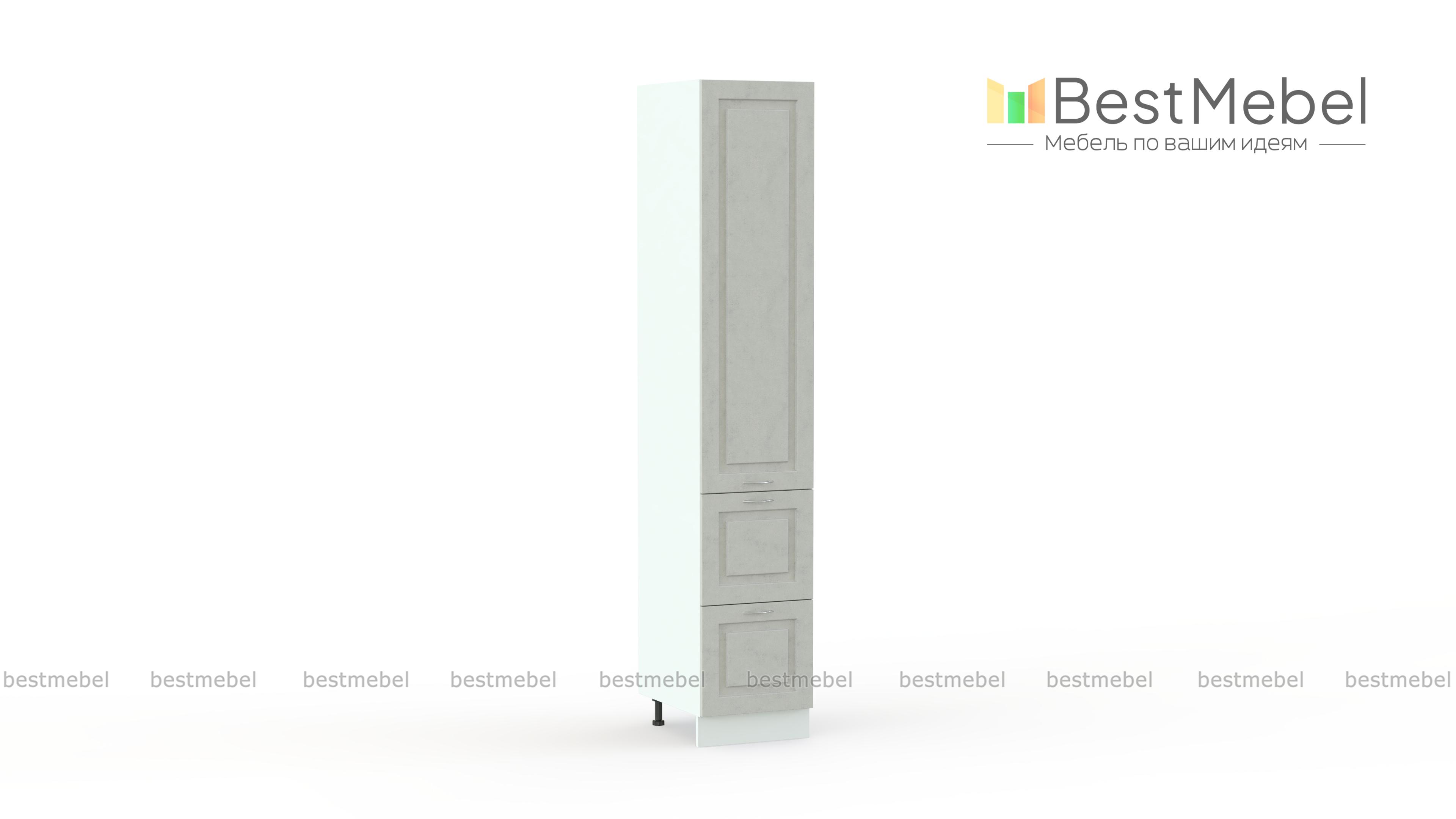 Пенал Гарда с ящиками BMS – практичная система хранения и интересный акцент в интерьере современной кухни. Высокий пенал оборудован двумя глубокими выдвижными ящиками в основании и распашным отделением с полками, в которых смогут разместиться посуда для готовки, продуктовые запасы, а также разнообразные кухонные аксессуары. Фрезерованные фасады с имитацией текстуры камня дополнены лаконичными хромированными ручками-скобами. Купить пенал Гарда с ящиками BMS приглашаем недорого в наш интернет-магазин.