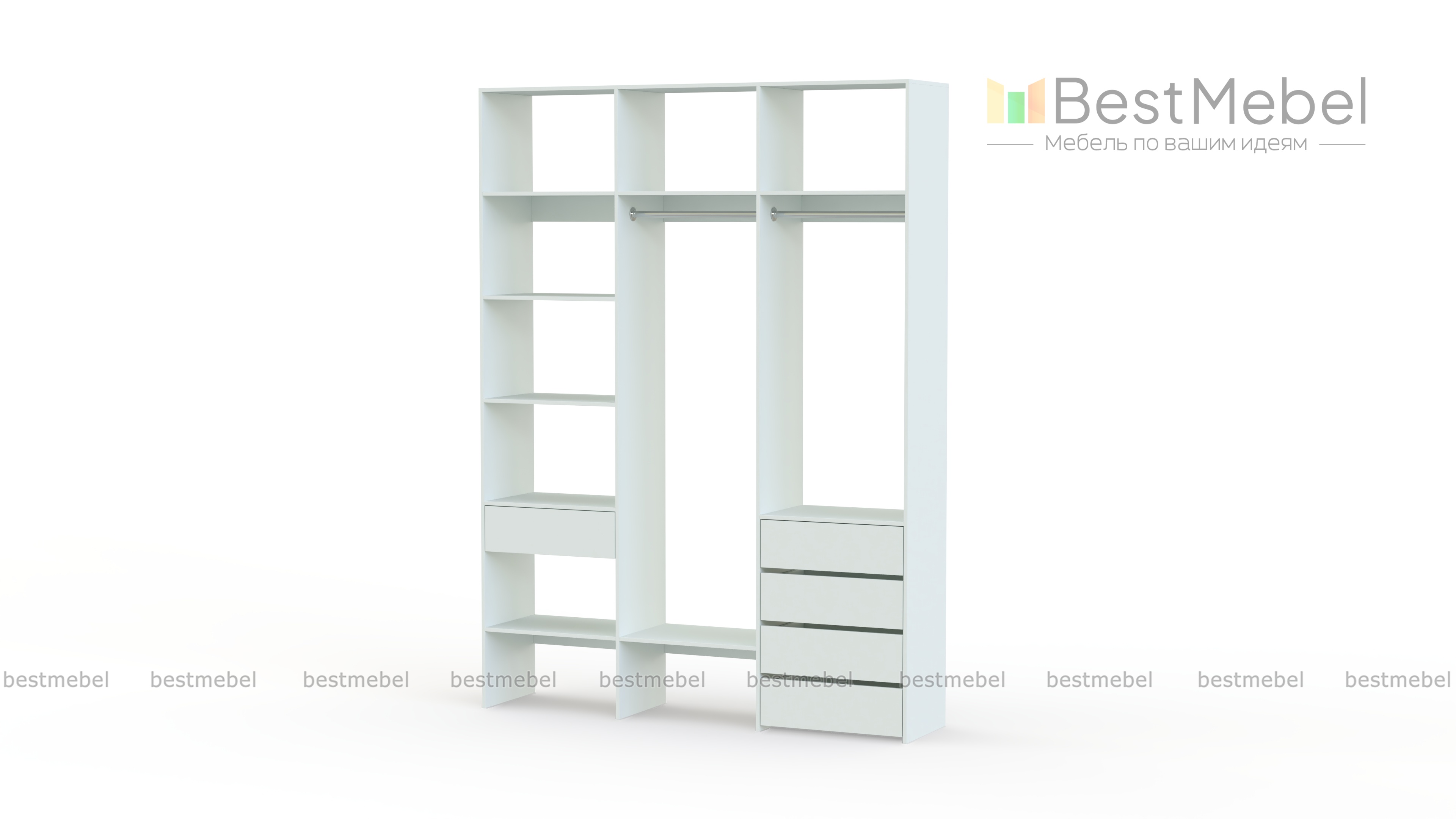 Стеллаж для одежды Мирта 17 BMS упорядочит хранение гардероба и сэкономит пространство. Многофункциональная конструкция с полками, двумя штангами и выдвижными ящиками на шариковых направляющих , усиленным дном излдсп в ящиках и дополнительными полками легко заменит платяной шкаф и комод. Открытая модель стеллажа обеспечивает отличный обзор содержимому, помогая быстро найти нужную вещь.