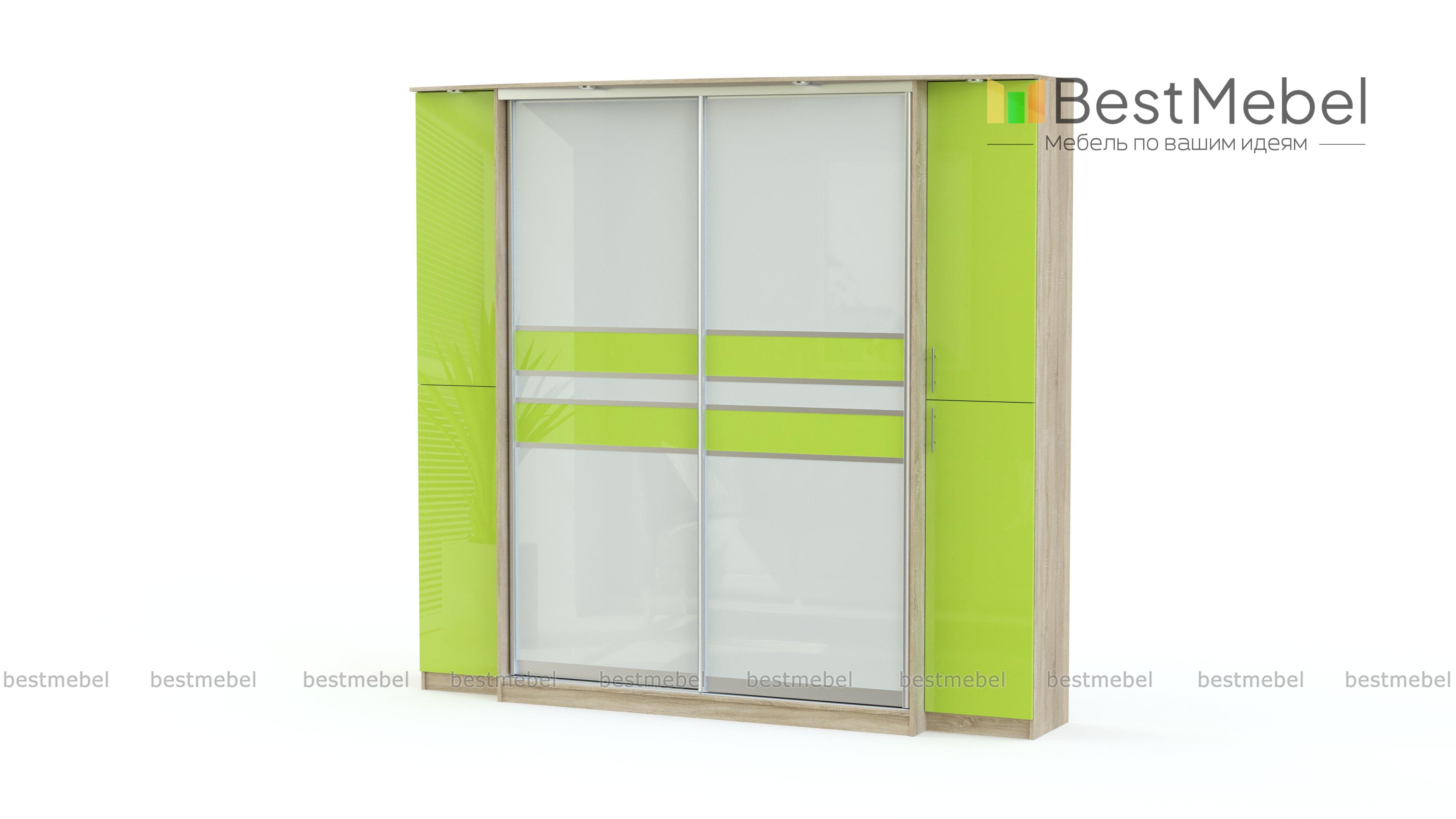 Современный и стильный шкаф-купе, который может похвастаться отличной вместительностью и большим количеством удобных отделений. Фасад изделия имеет яркие салатовые вставки, которые добавляют изделию изящности и оригинальности. Одной из главных особенностей представленной модели является удачно расположенная сверху подсветка, благодаря которой можно примерять вещи и смотреться в зеркало даже в тёмное время суток при недостаточном общем освещении.