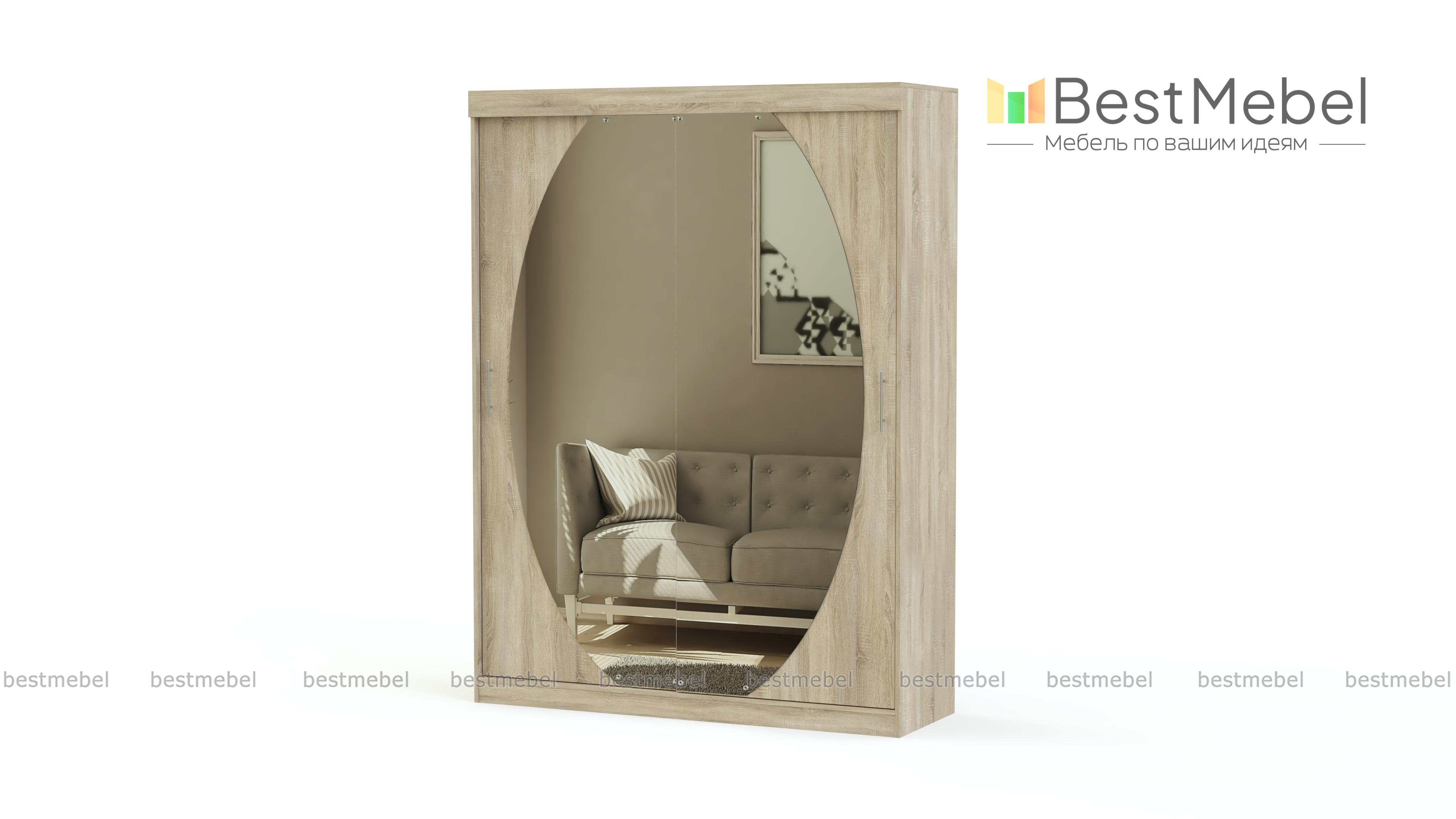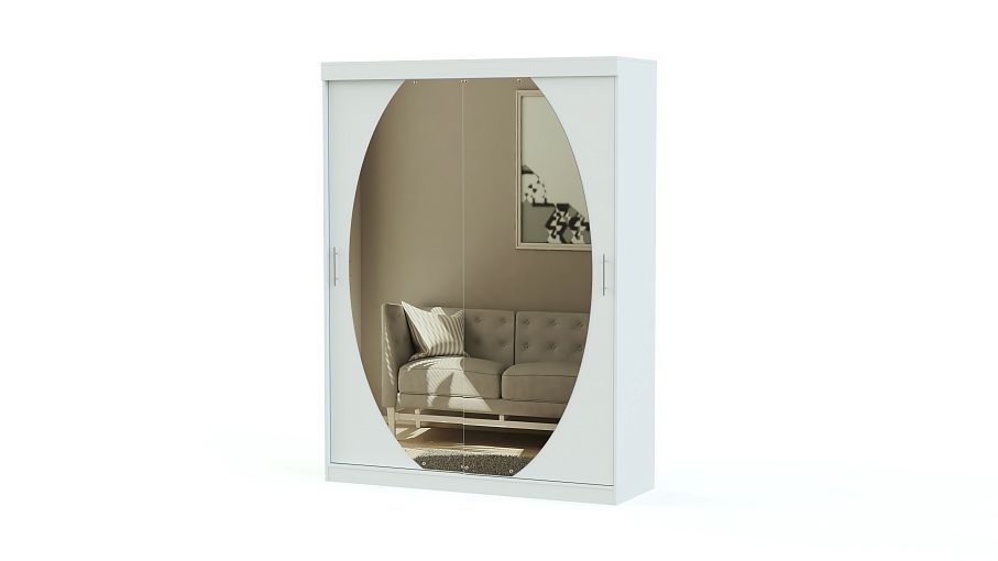 Элегантный шкаф-купе с зеркалом необычной формы. Последнее поможет зрительно увеличить площадь комнаты. Внутри шкаф имеет просторное отделение для вещей на вешалках и несколько объемных полок. Забудьте о смятых и скомканных вещах, которые едва влезают по ширине. На полках поместится одежда сразу в два ряда и еще останется место для того, чтобы ее аккуратно достать. Шкаф оснащен качественными алюминиевыми направляющими. Они обеспечат плавное и бесшумное открывание дверей. На нашем сайте можно выбрать цветовое оформление изделия, чтобы оно гармонично влилось в интерьер Вашего дома.