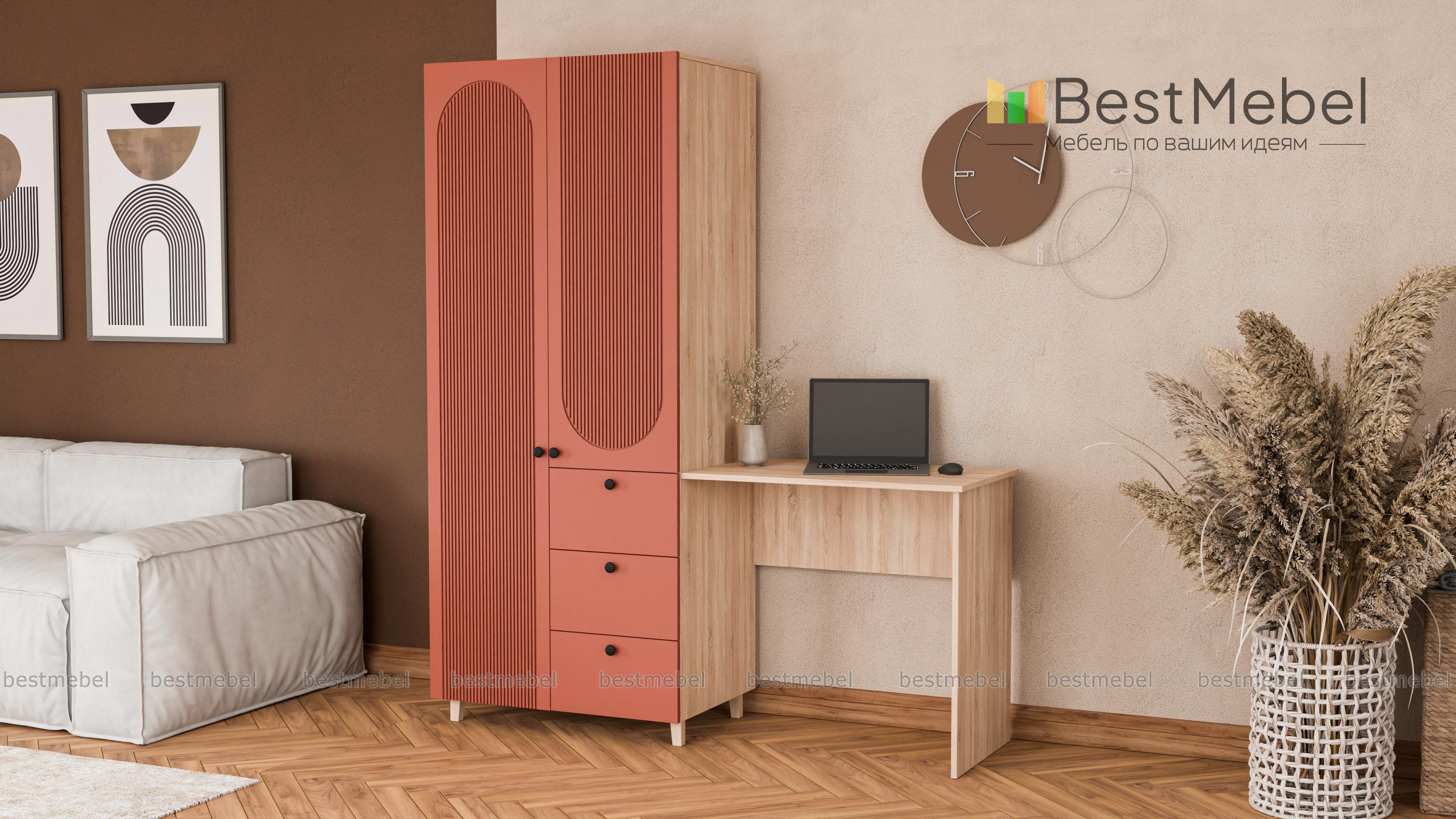 Шкаф со столом Рене 6 BMS объединил рабочую зону и удобную систему хранения. Элегантный гардероб с высокими ножками и фрезеровкой дополнен прямоугольным письменным столом справа. Для хранения вещей предусмотрены распашное отделение и ящики, а размеры столешницы позволяют разместить ноутбук, письменные принадлежности, материалы для творчества. Купить шкаф со столом Рене 6 BMS вы сможете в нашем интернет-магазине, подобрав размеры и наиболее подходящую цветовую гамму.