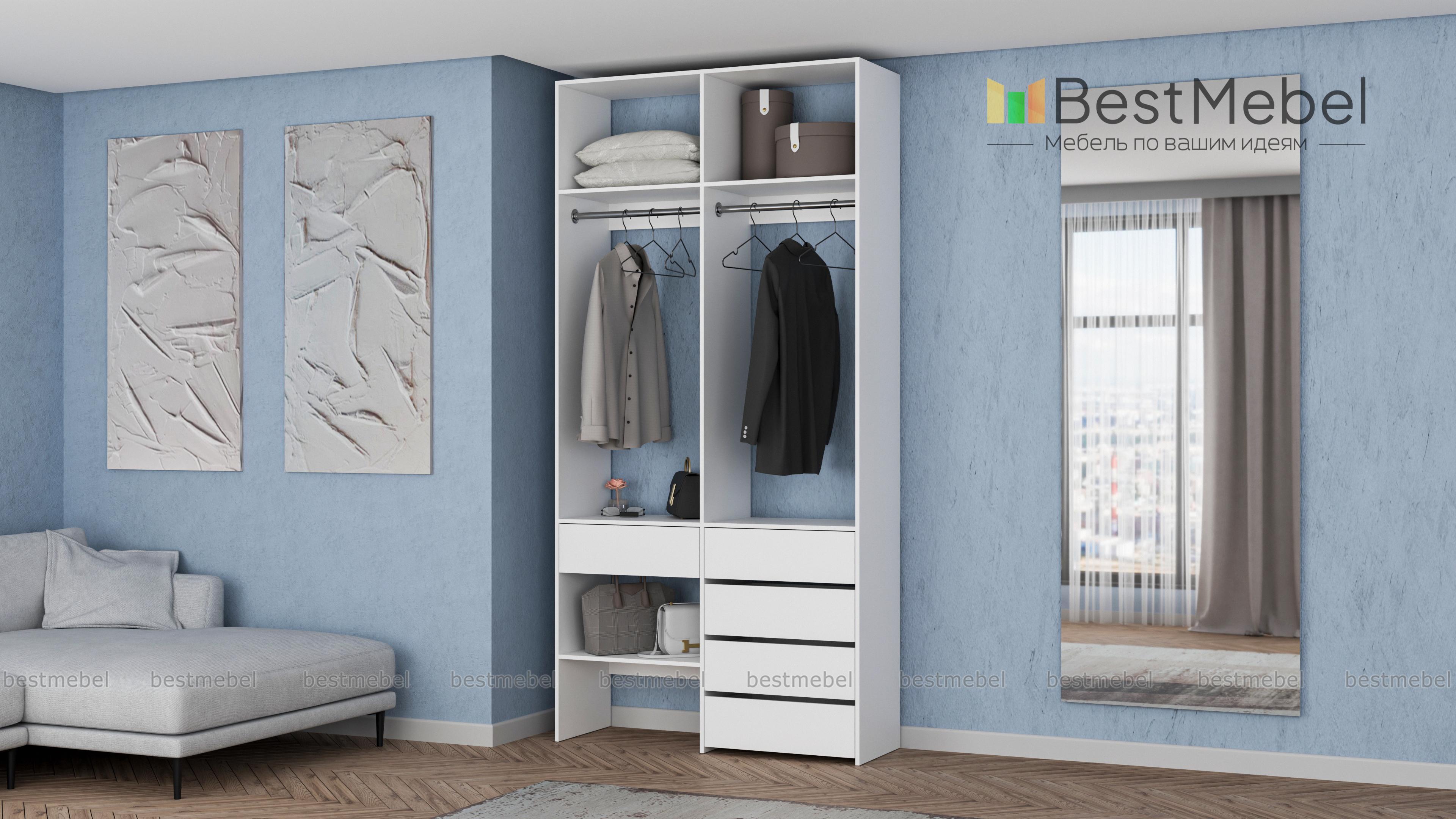 Стеллаж для одежды Мирта 46 BMS — стильный и функциональный, имеет удобную конфигурацию. Две штанги, полки на разной высоте и пять выдвижных ящиков максимально эффективно используют небольшое пространство. Двухсекционный стеллаж из прочной ламинированной ДСП прекрасно подходит для малогабаритных помещений, легко сохраняя порядок. Купить стеллаж для одежды Мирта 46 BMS в необходимом размере и любом оттенке из нашего каталога вы сможете на сайте интернет-магазина.