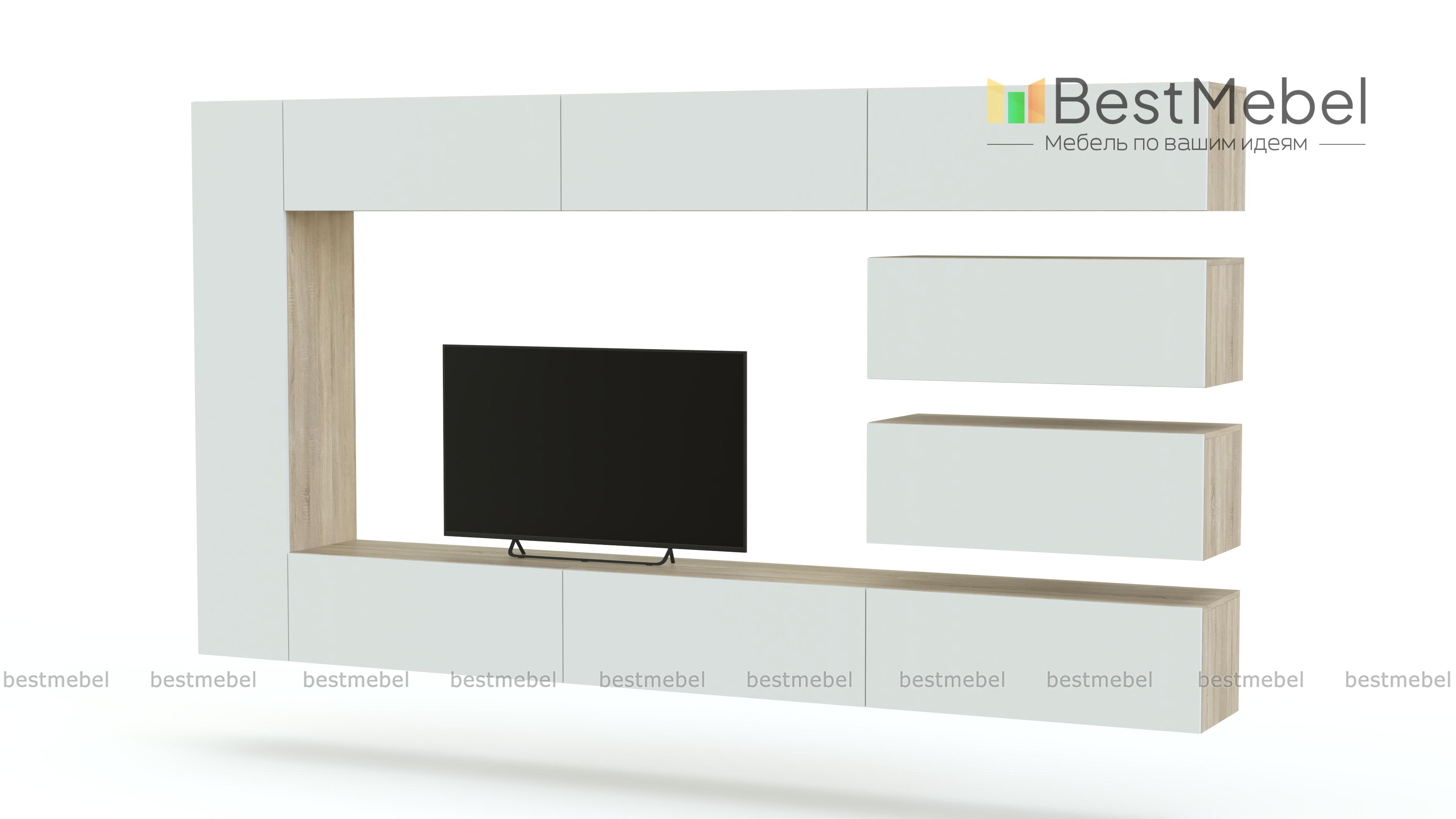 Яркая модульная композиция гостиного гарнитура Box-Plan 5 BMS займет центральное место в интерьере современной гостиной. В комплект входят семь модулей, расположенных по периметру, и образуюших в центре нишу для ТВ. Горизонтальные модули правой части закреплены на контрастной панели. Дверцы без ручек открываются легким нажатием. Фасады гостиной выполнены в роскошном матовом цвете, оптимальный оттенок которого вы сможете подобрать самостоятельно в нашем интернет-магазине.