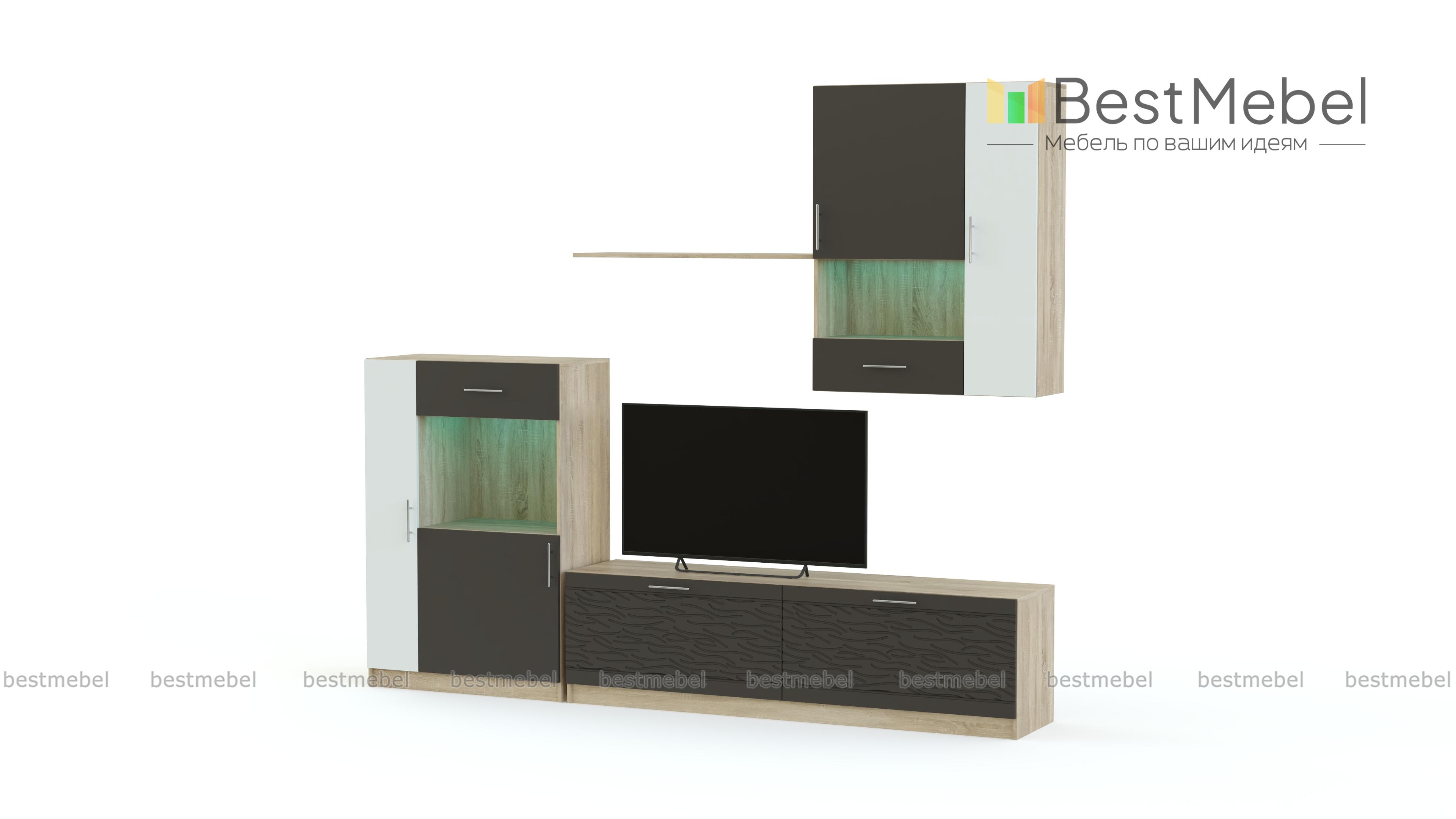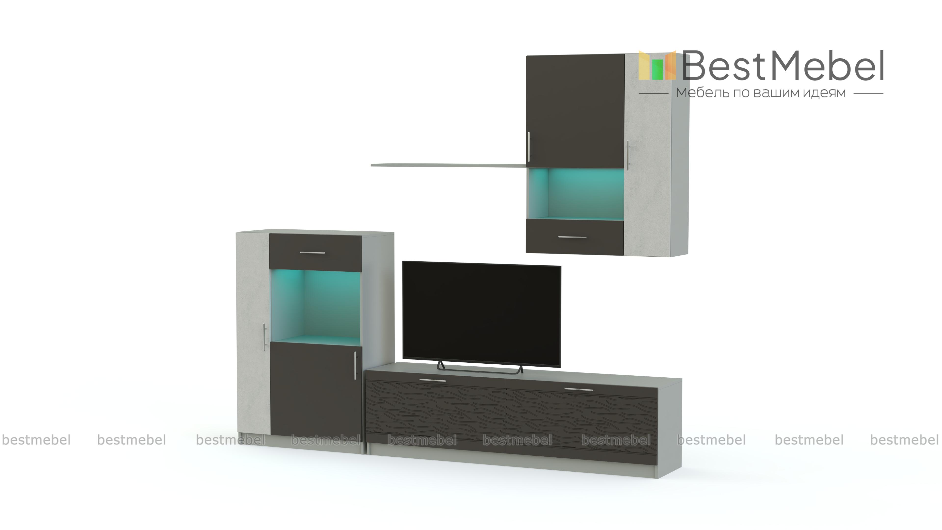 Стенка Вельвет 24 BMS выполнена в эффектном темном оттенке и станет центральным акцентом в интерьере современной гостиной. Минималистичный дизайн подчеркнет достоинства любой планировки, а модульная конструкция сэкономит полезную площадь. Стенка оборудована широкой низкой тумбой под ТВ, напольным двухдверным шкафом, открытой полкой и навесным шкафом с витринным отделением. Особенность комплекта – сочетание контрастных, украшенных 3D рисунком и матовых поверхностей. Купить стенку Вельвет 24 BMS, подобрав оптимальные параметры, приглашаем в наш интернет-магазин.