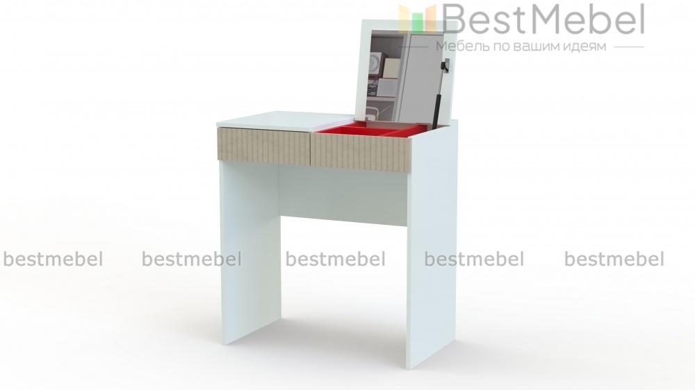Стол туалетный Осло 12 BMS с фактурным фасадом станет находкой для маленьких спален и студий. Благодаря простой форме и минималистичному дизайну столик легко вписывается в помещения любой планировки и комбинируется с другой современной мебелью. Откидная крышка столешницы, под которой скрыты зеркало и отсек для косметики, позволяет использовать стол как рабочий или макияжный. Купить стол туалетный Осло 12 BMS вы сможете в нашем интернет-магазине с учетом оптимальных размеров.