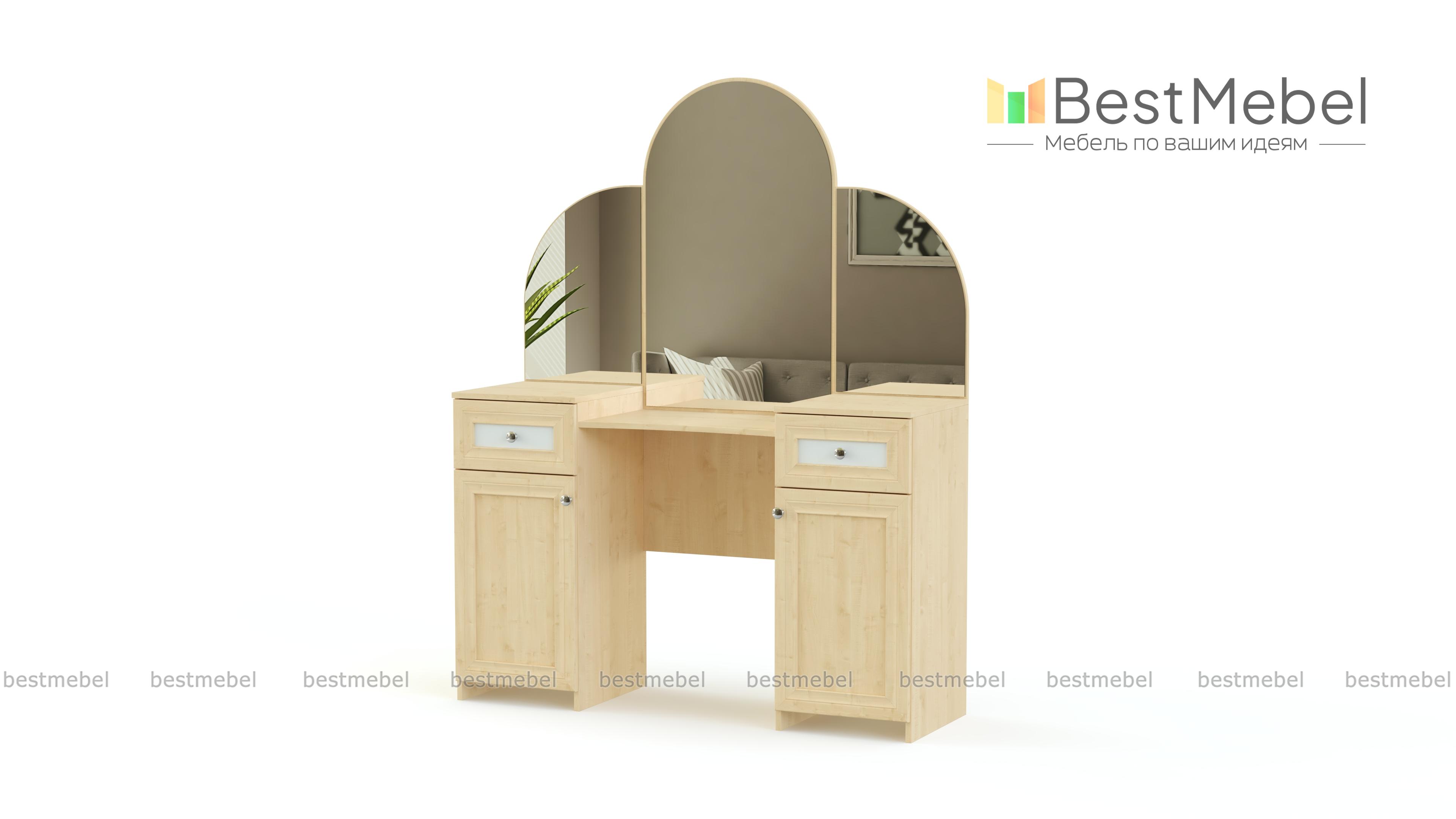 Элегантная модель для роскошной спальни в классическом стиле. Необычно декорированное, традиционное трехстворчатое зеркало особенно удобно для создания причесок и макияжа. Косметические средства смогут храниться в выдвижных ящиках боковых тумб или на полках за распашными дверцами. Благодаря насыщенным естественным цветам, изящному декору и неброской матовой золотистой фурнитуре туалетный столик Типони 2 BMS прекрасно впишется в интерьер и создаст в вашей комнате атмосферу уюта.