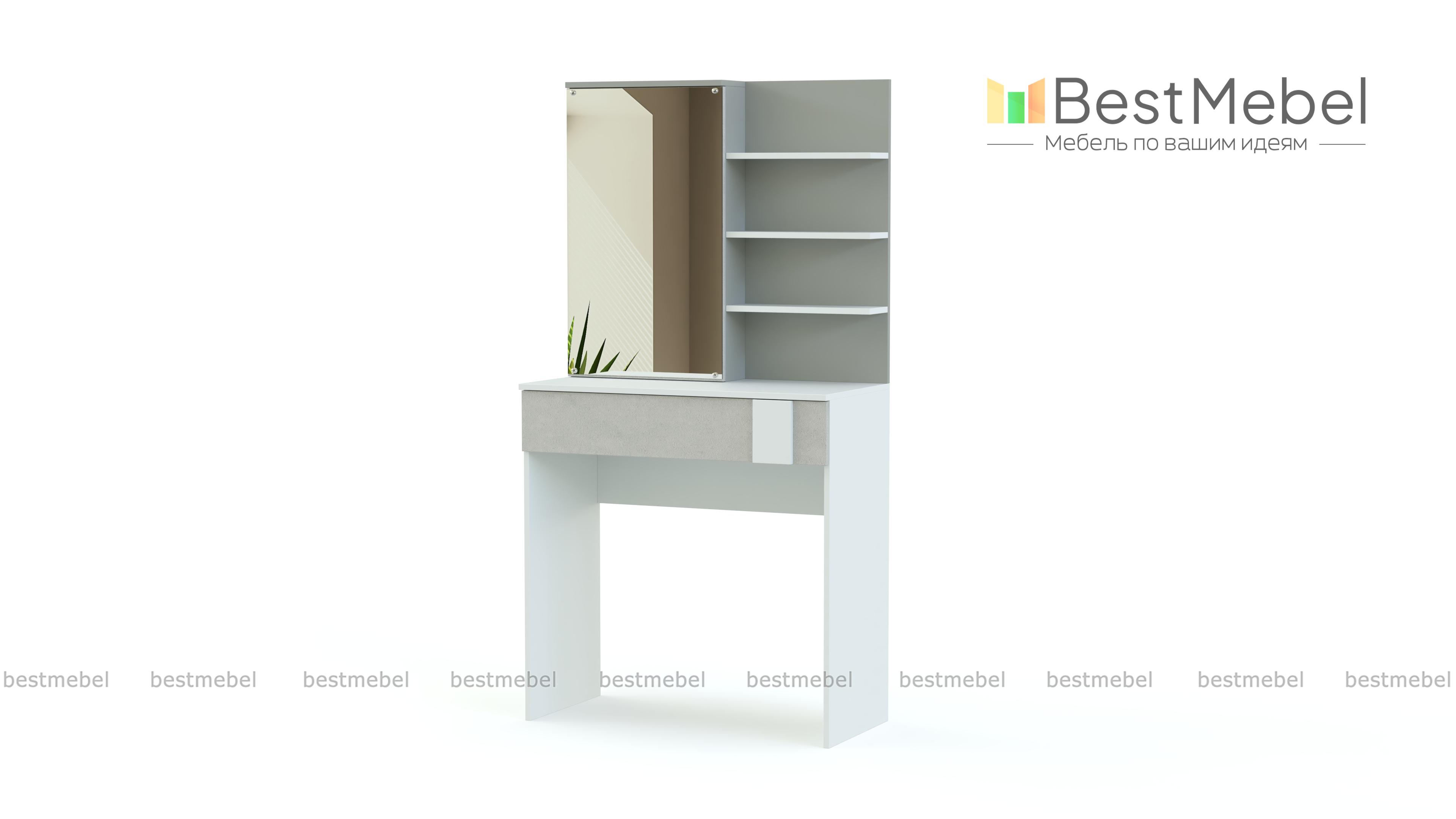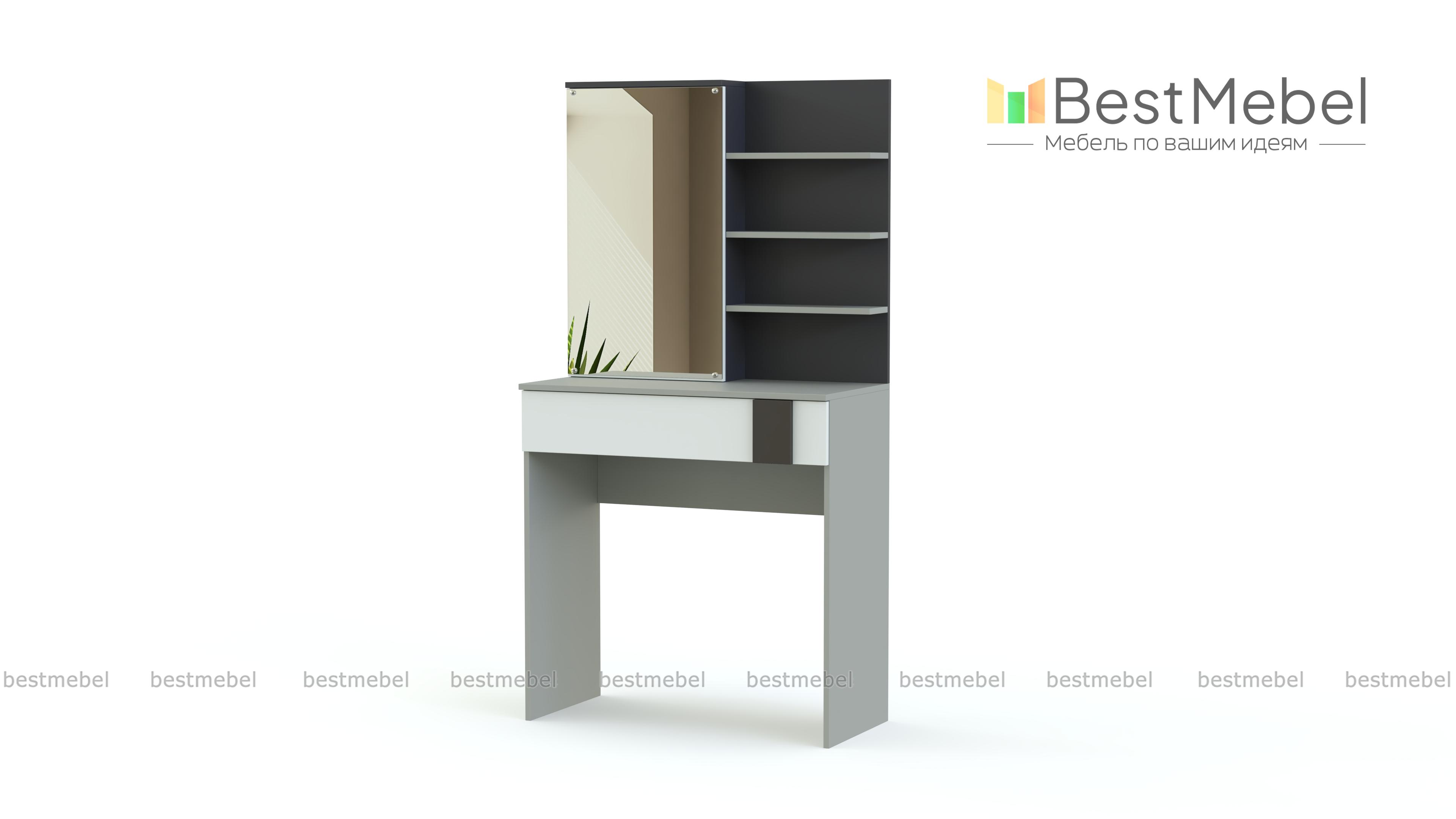 Туалетный столик Зоя 1 BMS сделает спальный интерьер более комфортным и функциональным. Модель лаконичного дизайна с геометричным декором фасада выполнена из качественной ламинированной плиты в контрастных тонах. Прямоугольный столик оборудован просторным выдвижным ящиком под столешницей, зеркальным шкафом и боковыми полочками для удобного хранения уходовых средств. Купить туалетный столик Зоя 1 BMS приглашаем к нам в интернет-магазин.