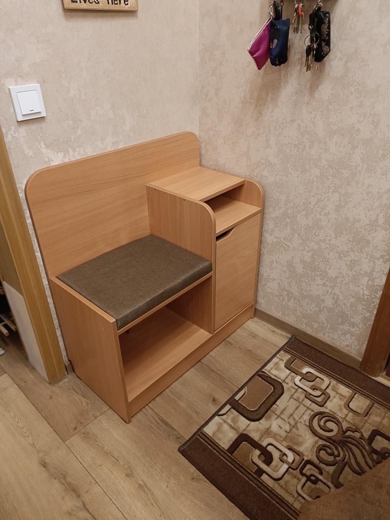 Прихожую заказали давно, а тумбу я увидела за 2 дня до доставки. Заказала под цвет прихожей, расстарались, и привезли в 1 день. Тумба маленькая, но основательно сделана, мама 120 кг сидит и тумба ни ГУ ГУ. Молодцы, спасибо🙏💕.